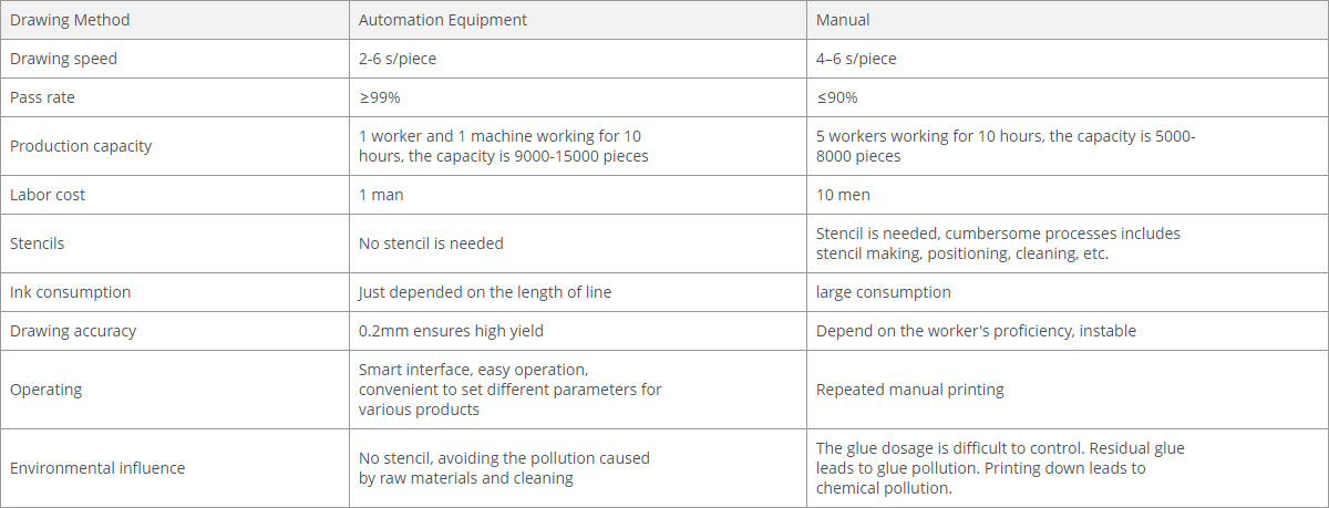 B. Mechanical line pen is controlled by Z-axis lifting motor and software to imitate hand drawn line. It draws lines on leather uppers.